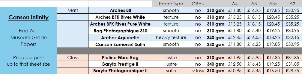 Personalised print service, Canson papers only, Call Chris for initial chat on 07920 044094